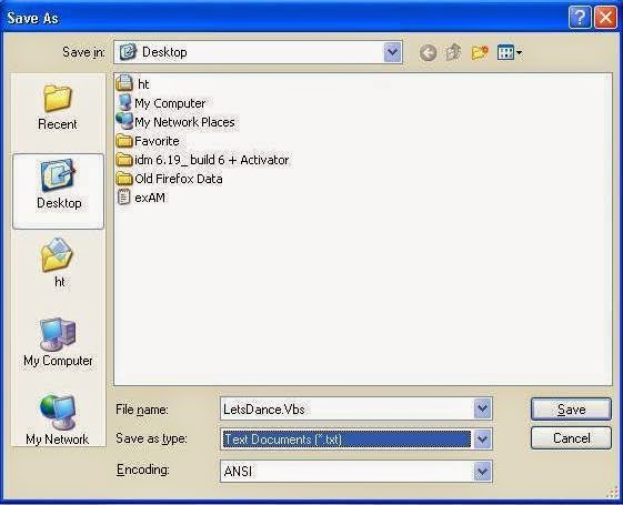 2. Lalu setelah itu Save dengan menggunakan format Vbs, sebagai contoh : LetsDance.Vbs