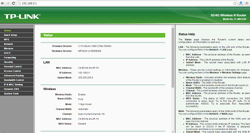 2. Lalu masuk ke menu setting Router TP link dengan mengetikkan alamat 192.168.0.1 pada browser, maka akan muncul kotak dialog , isikan username : admin dan password : admin. jika berhasil maka akan masuk ke dalam menu setting seperti berikut